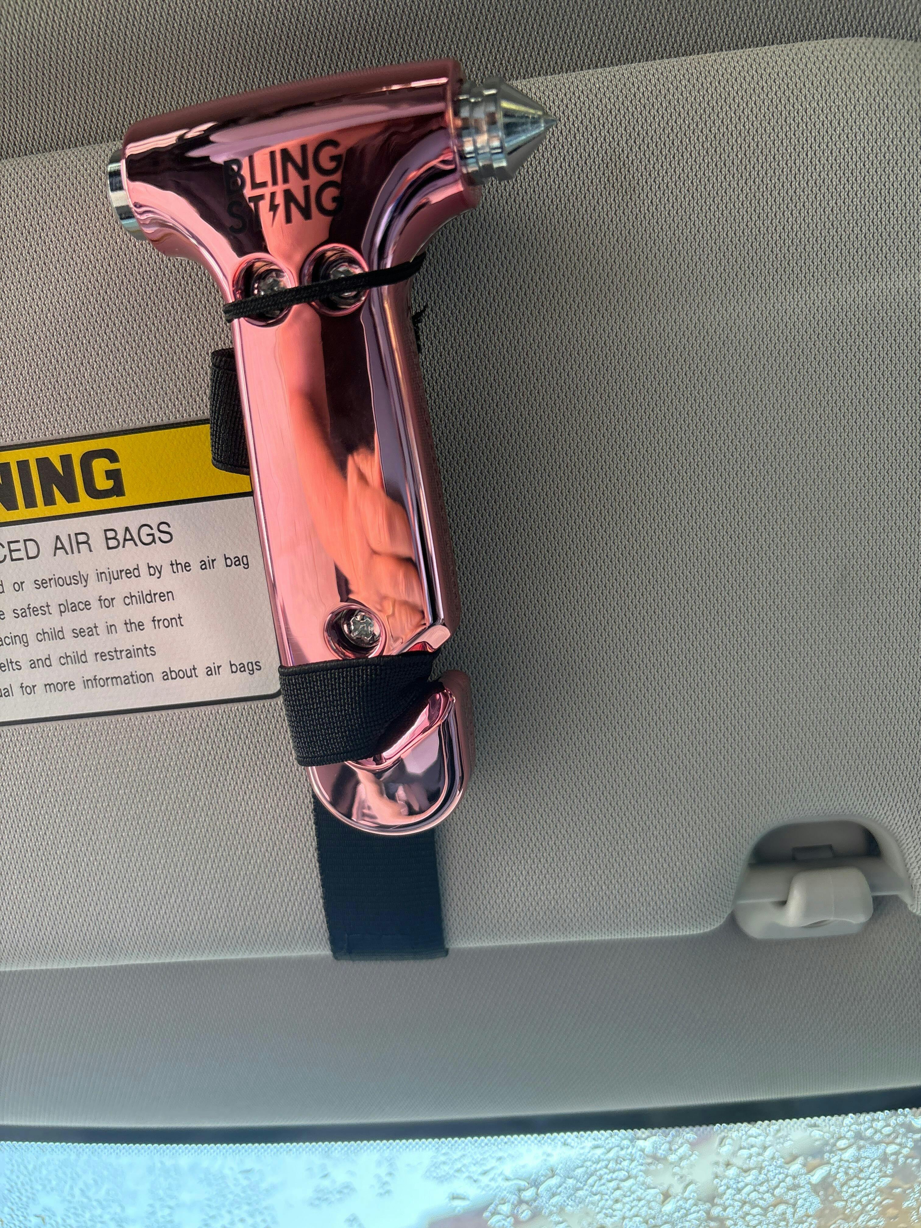 Our proprietary visor strap holds the (super-cute, of course) hammer securely in place on your visor. This is to ensure it’s accessible and ready when you need it, and not trapped in the glovebox or center console and out of arm’s reach.